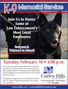 Curlew Hills treats the graves of these K-9 officers with dignity and reverence. On Veterans Day and Memorial Day, the K-9 service dogs graves are marked with a flag, along with all the other service men and women in our cemetery. Each Spring, we hold a memorial service to honor the dogs which have been interred in the past 12 months. K9 service dogs and their handlers from many area police and sheriff’s departments including the Clearwater Police Department and the Pinellas County Sheriff’s Office are in attendance at this special public service. Please check our News & Events page for the date of next K9 Service Memorial, which is open to the public.